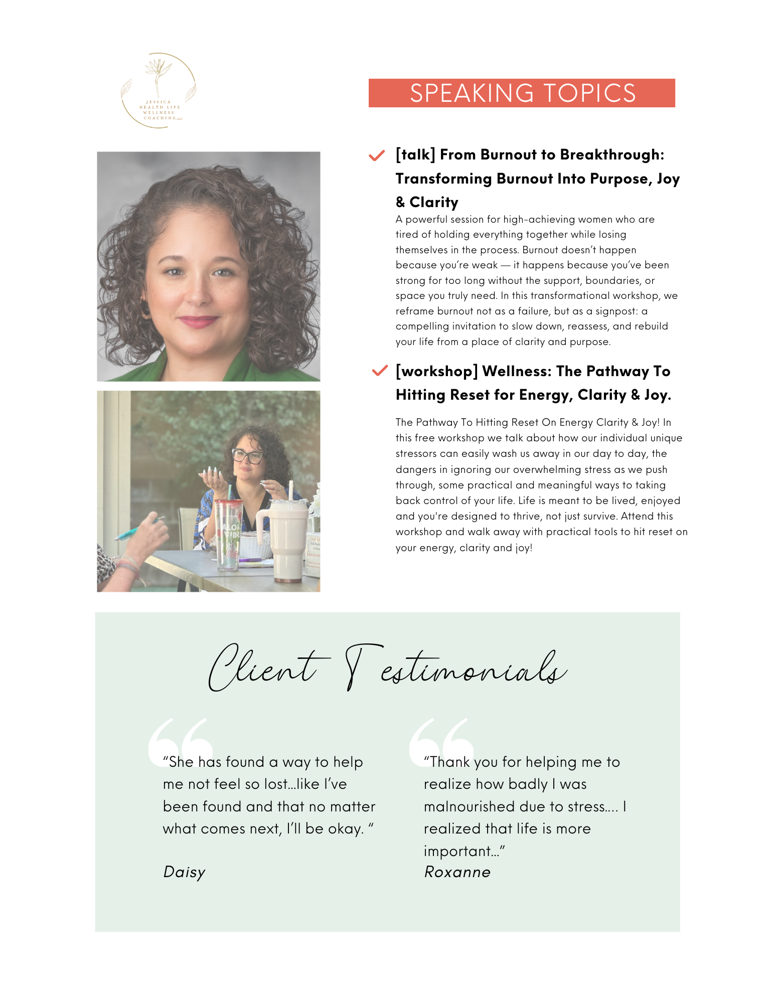 Jessica's mission extends beyond individual coaching through her transformative retreats, workshops, and speaking engagements, where she shares her science-backed strategies for energy management and stress reduction. Her unique combination of clinical knowledge, leadership experience, and personal triumph over burnout makes her an invaluable ally for women ready to move from surviving to thriving.